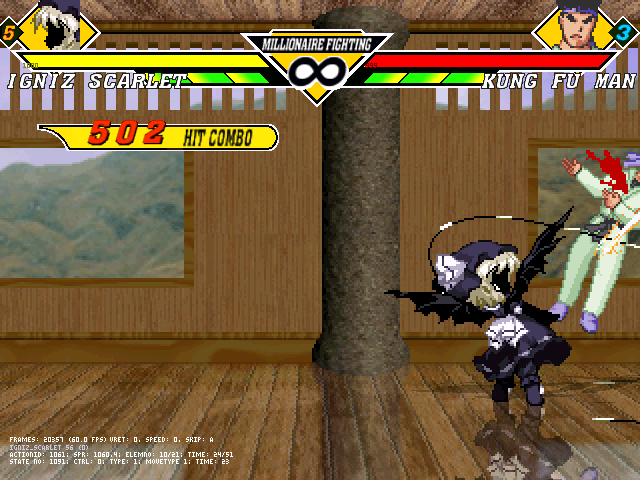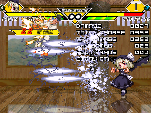 まず浮かせコンで途中で落とすことがほぼなくなりました。うん、やっぱ途中で落とすよりこっちのほうが断然カッコいい。ループ回数を変数使って数えさせるようにして、ジャグル制限に達したら超必で〆るようになってます。変数でコンボを制御させるのは実は初めてだったりする。