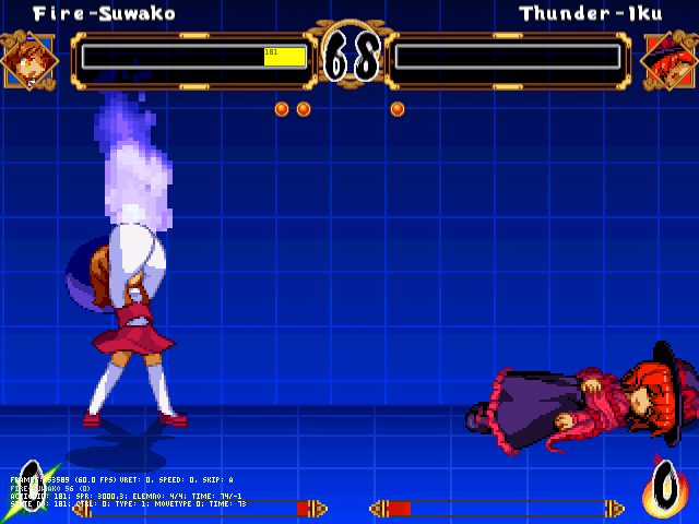 諏訪子は少しテコ入れ。通常版だいちをはらうごうかにnothitbyを入れ忘れていたので修正。ついでにMAX版共々無敵時間を長めに。発生保障がつくようになりました。それに合わせてAIも調整。それと12P性能をちゃんと設定してなかったのでこれを機に。