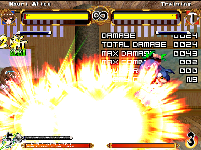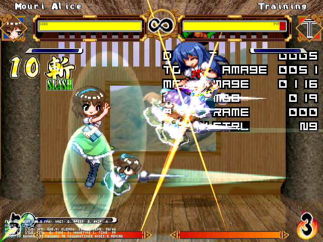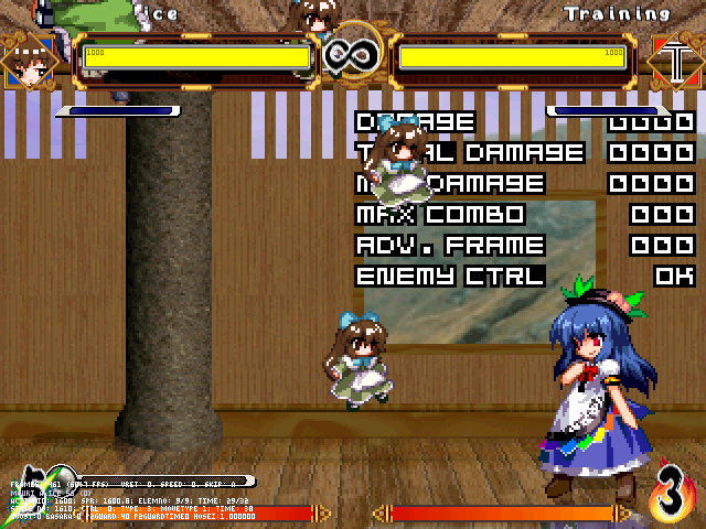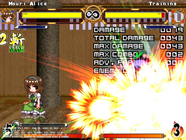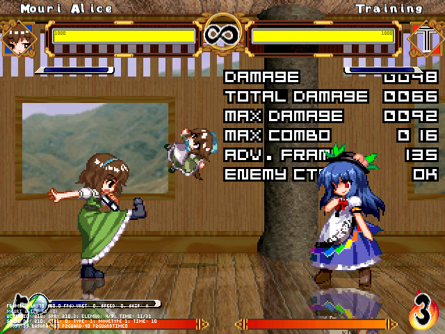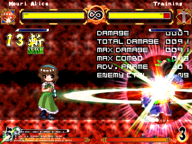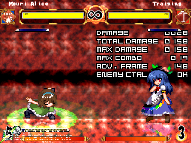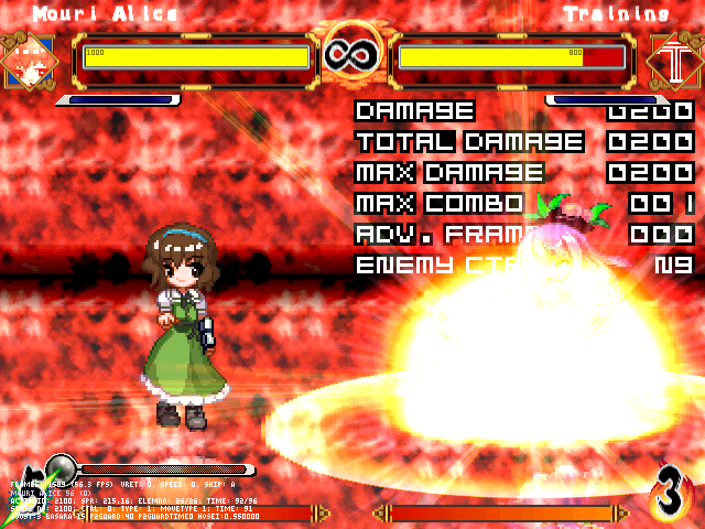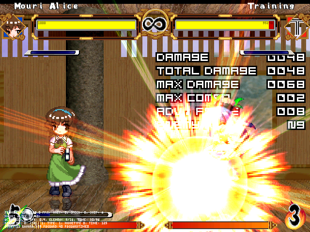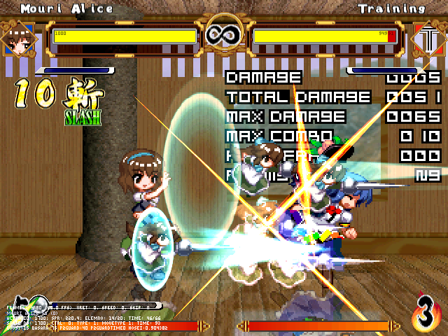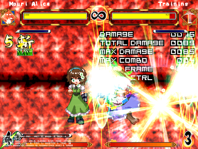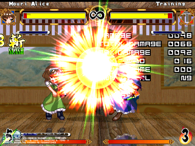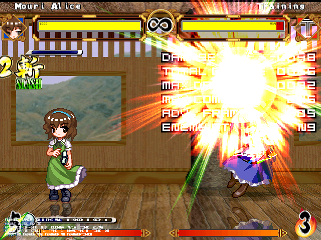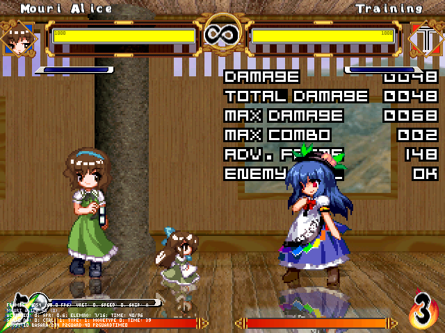 まず人形無操。飛び退きながら爆発する人形をばら撒く。前の爆弾兵同様強制ガークラ&無差別攻撃判定。原作より隙は大きくしたつもり。強制ガークラが強いかもだけど見てからダッシュやジャンプで避けられる。
