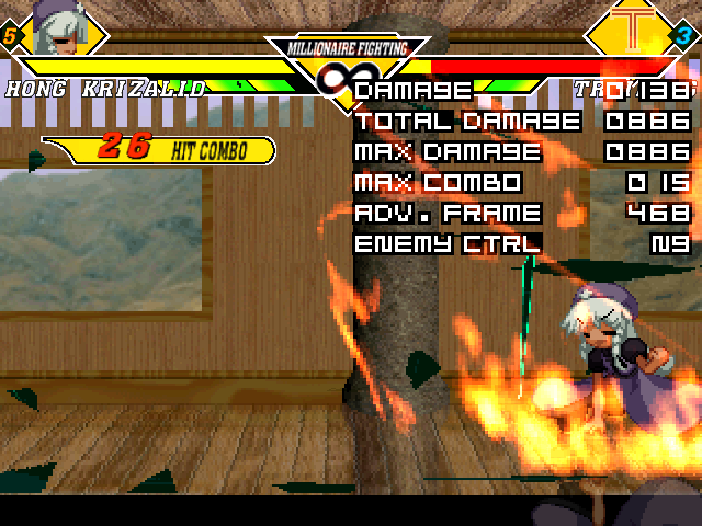 それとエンドオブエデンからの壁端連携も導入。相手を追い詰めた時にエンドオブエデンからデストラクション系の技につなぐことが可能(ただし壁に近すぎるとダメ)。エンドオブエデン>ヒート・デストラクションとやると右のスクショのようなダメージ。使えないようにするか悩んだけれど、状況限定だしエンドオブエデン自体決めにくい技なので残したままでいいかなと思った次第。これのためにステージ端判定用のヘルパーまで導入しちまいました。